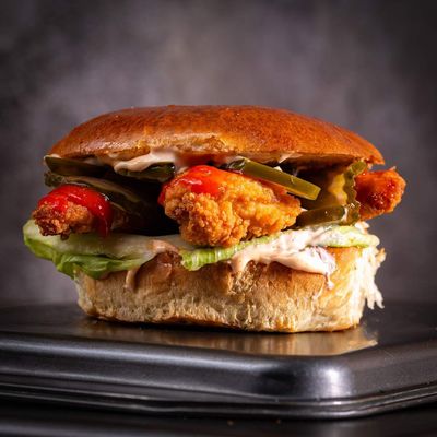 Stripsy z kurczaka, piklami ogórkowymi, polędwiczki z kurczaka, papryczkami jalapeno, ostrym czerwonym sosem, sosem spice-Mayo naszej produkcji, sałatą, musztardą
