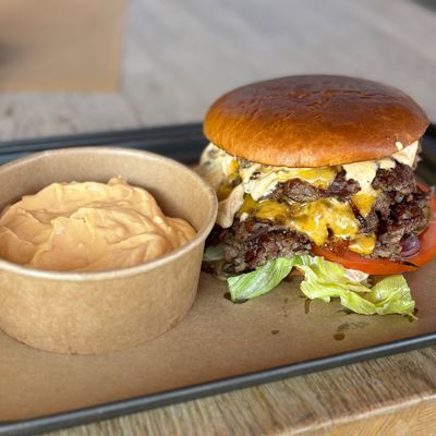 2x wołowina smash, 2x ser cheddar, cebula grillowana, pomidory, ogórek piklowany, specjalny sos, sałata