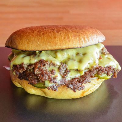 Wołowina smash 2x100g, czerwona cebula, ogórki piklowane, 2xser cheddar, musztarda, keczup