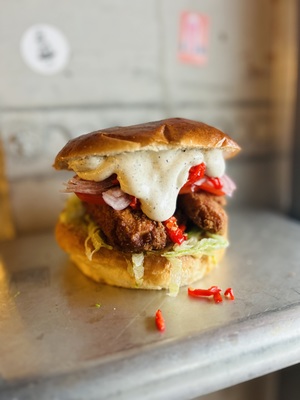 z polędwiczkami z kurczaka, papryczkami habanero, pomidorem, cebulą, sałatą, musztardą, sosem pieprzowym