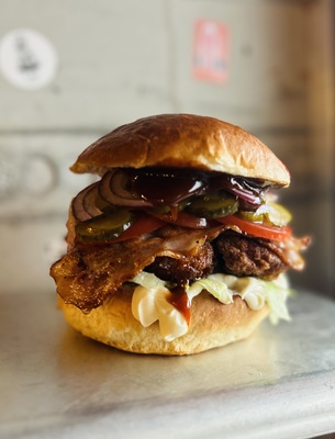 z polędwiczkami z kurczaka, podwójnym bekonem, sałatą, ogórkiem kiszonym, pomidorem, czerwoną cebulą, sosem mayo oraz sosem BBQ